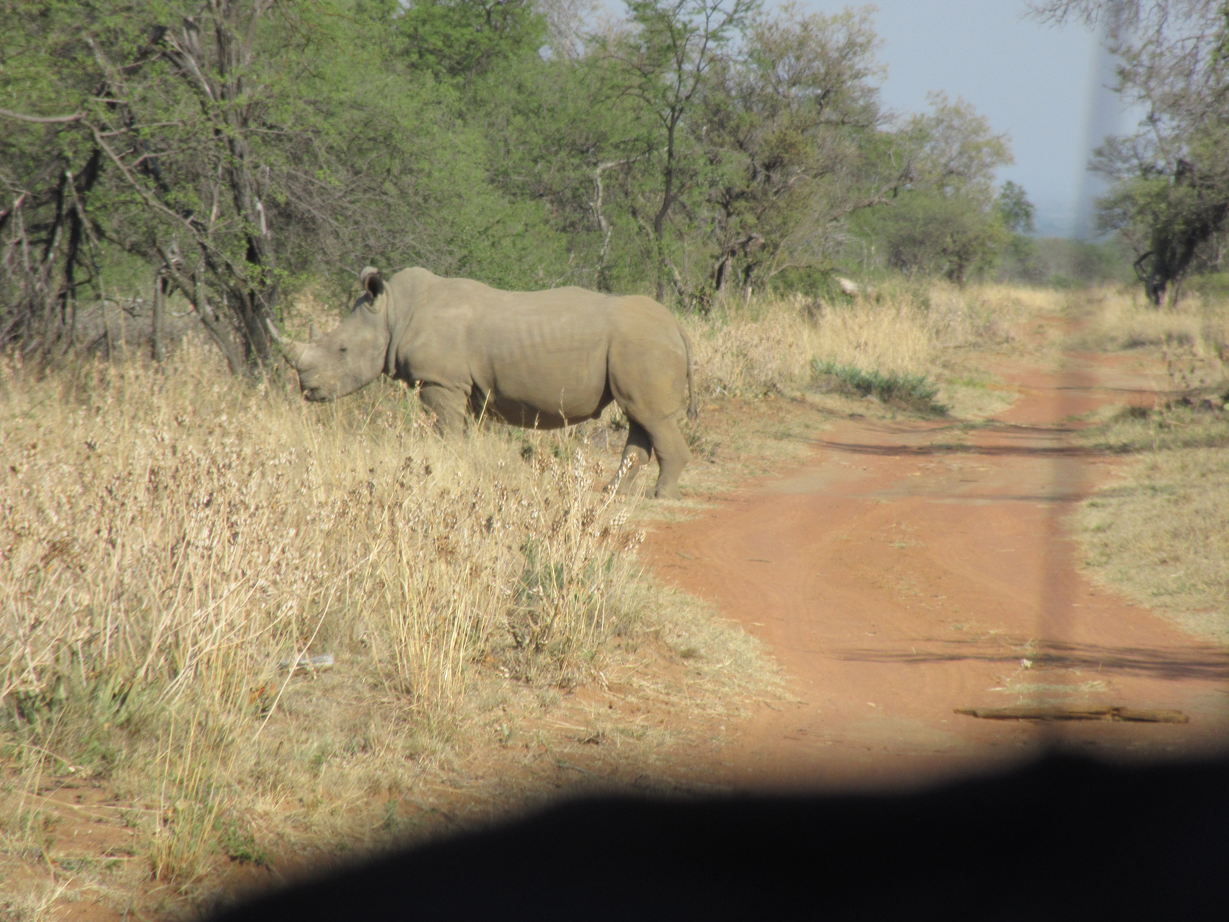 This animal is the white rhino, which is currently being protected from poachers by being put in this reserve. He was being tracked just like the elephant, for the same reasons. He was seen in the same spot the next day which is the next picture. And he was also seen relatively close to the lion pride’s territory. I felt a little scared for him once I realized where he was and where the lions were in relation to him.This is the same rhino as in the photo above and we found him by tracking his footsteps that he left in the dirt. The first time, he had birds eating the bugs and stuff off of him, but this time he didn’t. We also saw similar rhinos in different locations, but we couldn’t tell if it was the same one or not.
